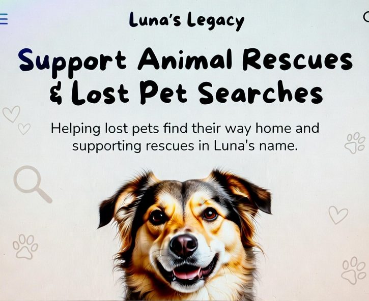 Here you will find comfort, gentle guidance, lost pet advice, shared stories, community support, and  fundraising activities — all in Luna’s name. Together, we keep her light shining while helping other animals and their families heal. 💕🌈